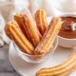 Churros and chocolate dip are an unbeatable duo in my house. I’ll also serve them alongside fresh berries or a creamy vanilla ice cream to balance the warm cinnamon flavors with something cool. These pairings turn this snack into a tiny celebration.
