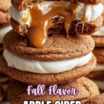 These Apple Cider Whoopie Pies combine soft, spiced cake rounds infused with reduced apple cider and are sandwiched with a creamy apple cider buttercream and a luscious caramel filling for a perfect fall treat.