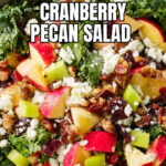A vibrant and hearty Apple Cranberry Pecan Salad featuring massaged kale, crispy bacon, sweet apples, tangy feta, dried cranberries, and candied pecans. This salad combines sweet, savory, and tangy flavors with a delightful crunch, perfect as a satisfying lunch or a colorful side dish.