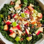 A vibrant and hearty Apple Cranberry Pecan Salad featuring massaged kale, crispy bacon, sweet apples, tangy feta, dried cranberries, and candied pecans. This salad combines sweet, savory, and tangy flavors with a delightful crunch, perfect as a satisfying lunch or a colorful side dish.