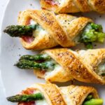 Delightful asparagus puff pastry bundles featuring tender asparagus wrapped in prosciutto, Gruyere cheese, and flaky puff pastry, baked to golden perfection for an elegant appetizer or snack.