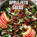 A vibrant and flavorful Autumn Harvest Honeycrisp Apple and Feta Salad featuring toasted pecans and pumpkin seeds, crispy prosciutto, fresh arugula, creamy avocado, juicy pomegranate arils, and tangy feta, all tossed in a homemade apple vinaigrette. A perfect mix of sweet, savory, and spicy elements for a seasonal fresh salad.