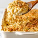 A creamy and cheesy baked macaroni and cheese featuring a blend of sharp cheddar, Parmesan, Velveeta, and a crunchy baked pretzel-panko topping for the perfect comfort food.