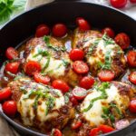 This One Pan Balsamic Chicken recipe features juicy, pounded chicken breasts cooked in a flavorful balsamic honey sauce, topped with fresh grape tomatoes, mozzarella, and basil then baked to perfection. It’s a simple, elegant, and easy-to-make dinner that combines tangy, sweet, and savory flavors in one skillet, perfect for weeknight meals or casual entertaining.