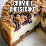 A rich and creamy Blueberry Crumble Cheesecake featuring a buttery cookie crust, fresh blueberry topping, and a crunchy crumble layer, baked to perfection in a water bath for a smooth, luscious texture.