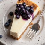 A rich and creamy Blueberry Crumble Cheesecake featuring a buttery cookie crust, fresh blueberry topping, and a crunchy crumble layer, baked to perfection in a water bath for a smooth, luscious texture.