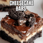 Delicious Brownie Cheesecake Bars featuring a rich brownie base layered with creamy cheesecake, topped with decadent chocolate ganache and Oreo cookies for a perfect indulgent treat.