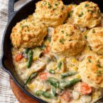 Once cooled, I transfer leftovers to an airtight container and refrigerate. It keeps well for up to 3 days. When I reheat, I cover the pot pie with foil to prevent the biscuits from drying out.