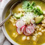 A flavorful and hearty Mexican Green Pozole Soup made with tender chicken, hominy, and a vibrant blend of tomatillos, poblano and jalapeño peppers, seasoned with traditional spices and garnished with fresh toppings.