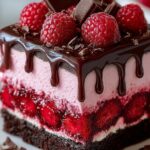 A rich and decadent Chocolate Raspberry Drip Cake featuring moist cocoa layers, smooth raspberry cream cheese filling, and a glossy dark chocolate ganache drip, topped with fresh raspberries and chocolate shavings for an elegant finish.
