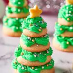 Delight in festive Stacked Christmas Tree Cookies featuring buttery sugar cookies layered with creamy green buttercream frosting and decorated with star sprinkles and pearl accents, perfect for holiday celebrations.