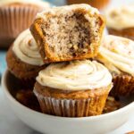 - Swirl cream cheese topping: Drop about 1 tablespoon of the cream cheese mixture atop each muffin and swirl it into the banana batter using a toothpick. The swirl won’t be smooth but will bake beautifully.