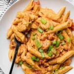 When your pasta is tender and the sauce has thickened, chunk in the cream cheese and stir it in until silky smooth. This is the magic that makes this recipe truly creamy and indulgent. Lastly, sprinkle over sliced green onions for a fresh, crunchy contrast. And just like that, you’re ready to dive in!