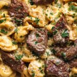 Garlic Steak Tortellini is a rich and creamy Italian-inspired dish featuring tender seared sirloin steak bites tossed with fresh cheese tortellini in a luscious garlic butter cream sauce, garnished with fresh parsley and parmesan cheese. Perfect for a comforting and flavorful meal.