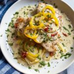 This Creamy Pepperoncini Chicken Skillet features tender chicken strips cooked in a rich and tangy sauce made with butter, garlic, onion, roasted red peppers, cream, parmesan, and pepperoncini peppers. It’s a flavorful one-pan meal that can be served over vegetables, pasta, or rice for a satisfying dinner.