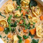 A rich and comforting Creamy Sausage Tortellini Soup featuring spicy Italian sausage, sweet potatoes, and tender tortellini in a flavorful broth with a touch of cream and fresh herbs.