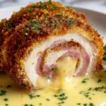 Crispy Creamy Chicken Cordon Bleu features tender chicken breasts stuffed with layers of Swiss cheese and ham, coated in a crunchy panko breadcrumb crust, and served with a rich and creamy Dijon Parmesan sauce. This classic dish delivers a delightful combination of textures and flavors, perfect for an impressive main course.