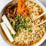 This easy vegan ramen recipe combines toasted sesame oil, fresh garlic and ginger, shiitake mushrooms, shredded carrots, and a flavorful broth made with vegetable stock, soy sauce, and rice vinegar. Quick to prepare and customizable with optional toppings like tofu and scallions, it’s a comforting and healthy meal perfect for any day.