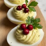 - Garnish and serve. Decorate each deviled egg with a small parsley leaf to mimic holly leaves and place two or three pomegranate seeds on top to represent berries. Arrange on a tray and serve chilled for a festive presentation.