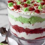 This festive Christmas Trifle Dessert features layers of vibrant red velvet and green-tinted white cake combined with a creamy sweetened cream cheese mixture, perfect for holiday celebrations and serving 12 guests.