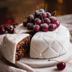 - Optional Quilting Decoration: Using a blunt edge like a cake server, press diagonal lines about 2.5 cm / 1″ apart around the sides of the fondant to create diamond shapes. Using a damp wooden skewer, press a small indent at diamond intersections and attach silver balls for a festive finish. Top with cherries dusted with icing sugar.
