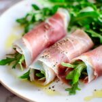 - Season and roll: Sprinkle fresh cracked black pepper over the arugula leaves, then carefully roll each prosciutto slice tightly to enclose the fillings and form a neat roll up.