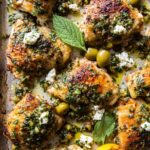 - Prepare Chicken: On a rimmed baking sheet, combine chicken, 2 tablespoons olive oil, finely chopped garlic, parsley, oregano, kosher salt, and black pepper. Toss well to coat the chicken evenly. Arrange lemon halves, whole garlic cloves, and slices of butter on and around the chicken pieces.