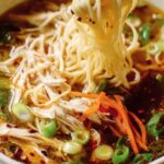 Aromatic Ginger Scallion Chicken Noodle Soup is a comforting and flavorful dish featuring tender chicken thighs simmered with garlic, ginger, and scallions, served with ramen noodles and a tangy soy-vinegar drizzle enhanced by toasted sesame oil and crispy chili oil.