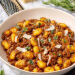 A classic Italian dish featuring tender gnocchi smothered in a rich, flavorful Bolognese sauce made with ground beef, fresh herbs, and crushed tomatoes. Perfect for a comforting dinner.