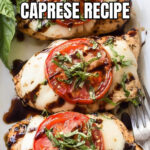 A delicious and fresh Grilled Chicken Caprese featuring perfectly seasoned grilled chicken breasts topped with melted mozzarella, fresh tomato slices, basil, and a sweet tangy homemade balsamic reduction. Ideal for a light and flavorful main course.