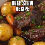 This easy slow cooker beef stew recipe features tender chunks of beef chuck cooked with pearl onions, baby carrots, and baby potatoes in a rich, savory broth made with red wine, beef broth, tomato paste, and aromatic herbs. Perfectly cooked in a slow cooker for deep flavors and a comforting, hearty meal.