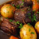 This easy slow cooker beef stew recipe features tender chunks of beef chuck cooked with pearl onions, baby carrots, and baby potatoes in a rich, savory broth made with red wine, beef broth, tomato paste, and aromatic herbs. Perfectly cooked in a slow cooker for deep flavors and a comforting, hearty meal.
