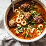 Because the pasta can get mushy when frozen, I prefer to freeze the meatballs and broth separately if I’m planning long-term storage. Freeze the meatballs in a zip-top bag and the broth in containers, then combine and reheat fresh with freshly cooked pasta for the best texture.
