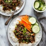 - Serve: Serve the beef hot over cooked brown rice, quinoa, or cauliflower rice. Top generously with pickled carrots, cucumbers, and toasted sesame seeds.