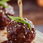 - Glaze and Garnish: Once meatballs are cooked, brush them generously with the prepared glaze. Sprinkle sliced green onions and toasted sesame seeds on top for garnish and extra flavor before serving.