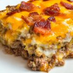 A delicious low carb bacon cheeseburger casserole combining seasoned ground beef, crispy bacon, pickles, and melted cheddar cheese in a creamy egg custard base, perfect for a satisfying and keto-friendly meal.