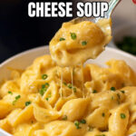 A creamy and comforting Mac & Cheese Soup featuring tender pasta shells in a rich, cheesy broth with aromatic vegetables and spices, perfect for a cozy meal.