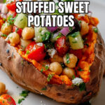 A flavorful and healthy Mediterranean-inspired dish featuring roasted sweet potatoes stuffed with a refreshing mixture of chickpeas, cherry tomatoes, cucumber, olives, feta cheese, and fresh herbs, dressed in a tangy lemon-oregano dressing.