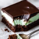 Classic Mint Chocolate Brownies featuring a rich chocolate base layered with creamy mint frosting and a smooth chocolate topping. Perfectly fudgy and bursting with mint flavor, these brownies are a delightful treat for mint and chocolate lovers.