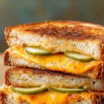 A deliciously tangy Pickle Grilled Cheese Sandwich featuring melted cheddar cheese, crunchy dill pickles, and a hint of hot sauce, all grilled to golden perfection with buttery bread.