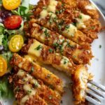 Pretzel Crusted Chicken is a crunchy and flavorful dish featuring chicken breasts coated with crushed salted pretzels and fried to golden perfection. Served with a creamy mustard cheddar sauce, this recipe offers a delicious twist on traditional breaded chicken with a satisfying crunchy texture and rich cheesy flavor.