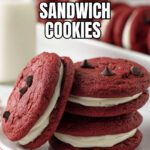 Delicious and visually stunning Red Velvet Sandwich Cookies featuring soft red velvet chocolate chip cookies filled with creamy vanilla frosting, perfect for a sweet treat or special occasion.