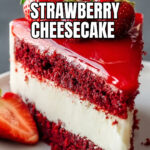 This Red Velvet Strawberry Cheesecake features a moist red velvet cake base topped with a smooth, creamy cheesecake layer, finished with a luscious strawberry preserve topping and fresh strawberries. Perfect for a special occasion dessert, it combines classic flavors and impressive presentation.