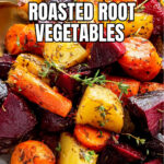 A simple and delicious recipe for roasted root vegetables featuring carrots, parsnips, beets, sweet potato, and red onion, seasoned with fresh herbs and garlic powder, then roasted to caramelized perfection.