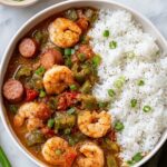 This Shrimp and Sausage Gumbo is a hearty and flavorful Louisiana-inspired dish combining a rich roux, spicy sausage, tender shrimp, and fresh vegetables. Perfect for a comforting meal with a touch of Cajun spice, this gumbo simmers to develop deep flavors and is garnished with green onions for a fresh finish.