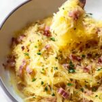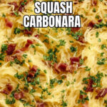A creamy and flavorful Spaghetti Squash Carbonara that combines roasted spaghetti squash strands with a rich egg and Parmesan sauce, crispy bacon, and garlic. This lighter twist on classic carbonara is gluten free and perfect for a satisfying dinner.