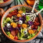I wouldn’t suggest freezing this salad — once the greens, veggies, and cheese skulls thaw, their textures suffer. It’s best enjoyed fresh or refrigerated short-term.