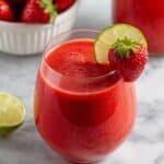 - Garnish and Serve: Pour the cocktail into glasses and garnish with an extra strawberry and/or lime slice. Serve immediately.