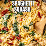 A creamy Tuscan chicken dish served with tender spaghetti squash strands, infused with garlic, sun-dried tomatoes, and fresh spinach for a flavorful low-carb alternative to traditional pasta.
