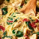 A creamy Tuscan chicken dish served with tender spaghetti squash strands, infused with garlic, sun-dried tomatoes, and fresh spinach for a flavorful low-carb alternative to traditional pasta.